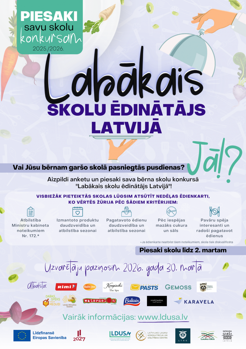 Aicinām vecākus pieteikt skolas konkursam no 4.februāra līdz 2.martam, lai pēc tam biežāk izvirzītās mācību iestādes lūgtu iesūtīt nedēļas ēdienkarti, ēdienu foto un papildu aprakstu, ko izvērtēs konkursa žūrija. Uzvarētāji tiks noteikti sešās nominācijās: Vidzemē, Zemgalē, Kurzemē, Latgalē, Rīgā un visā Latvijā kopumā. Arī šogad LLKC pasniegs īpašu specbalvu tai pavāru komandai, kura maltīšu pagatavošanā izmanto pēc iespējas vairāk vietējas izcelsmes produktus. Tāpat arī LTRK pasniegs simpātiju dāvanu vienai no pavāru komandām.