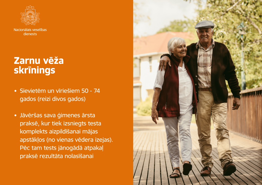 Valsts apmaksātu zarnu vēža skrīningu reizi divos gados ieteicams veikt sievietēm un vīriešiem vecumā no 50 līdz 74 gadiem. Lai veiktu pārbaudi, sākotnēji jāvēršas sava ģimenes ārsta praksē. Praksē tiek izsniegts testa komplekts slēpto asiņu noteikšanai fēcēs, kas ir jāaizpilda mājas apstākļos (no vienas vēdera izejas), pēc tam tests jānogādā praksē rezultāta nolasīšanai. Būtiski, ka pirms testa veikšanas vairs nav jāievēro noteikti ēšanas ierobežojumi, jo tiek izmantots jaunā tipa tests, skaidro NVD.