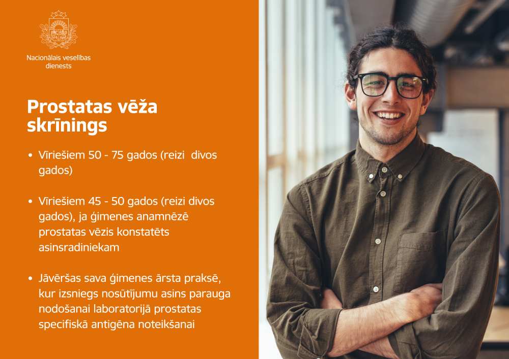 Prostatas jeb priekšdziedzera vēža skrīnings nozīmē specifisku asins analīžu veikšanu reizi divos gados visiem vīriešiem vecumā no 50 līdz 75 gadiem, informē NVD. Pārbaude ieteicama arī vīriešiem no 45 līdz 50 gadu vecumam (reizi divos gados), ja ģimenes anamnēzē prostatas vēzis ir konstatēts asinsradiniekam. Lai veiktu pārbaudi, jāsazinās ar sava ģimenes ārsta praksi. Vizītes laikā tiks izsniegts nosūtījums asins parauga nodošanai, lai laboratorijā noteiktu prostatas specifisko antigēnu (PSA).