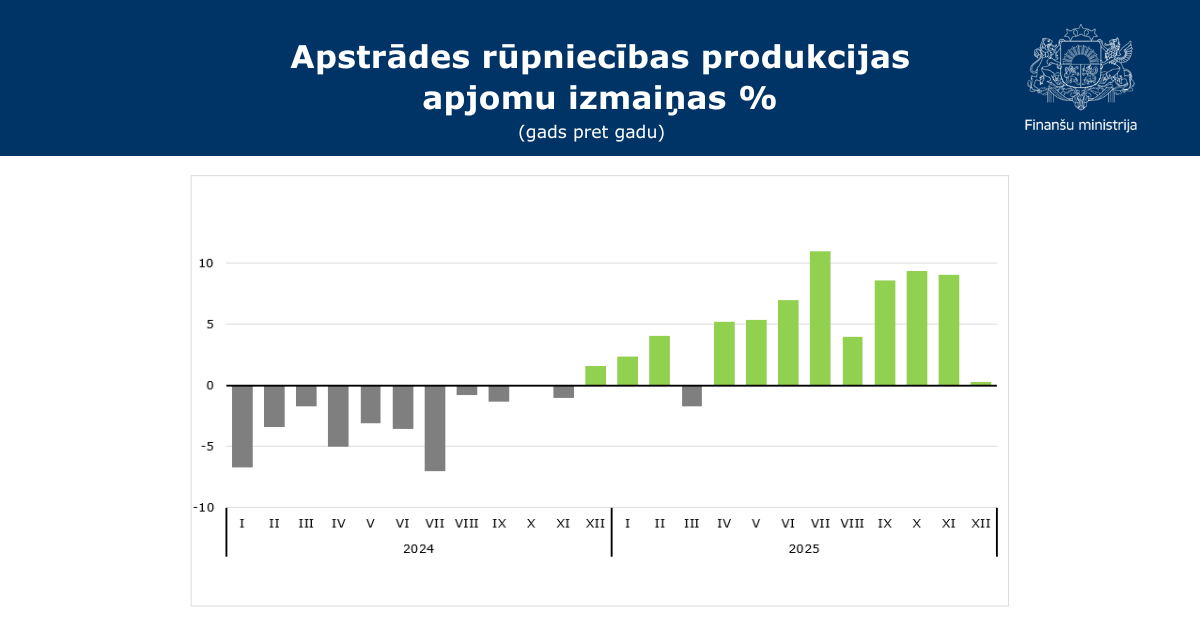 Apstrādes rūpniecības apjomi stabili auga visa 2025. gada garumā, lielāko pozitīvo ietekmi veidojot tieši lielākajām apstrādes rūpniecības apakšnozarēm – pārtikas produktu ražošana kāpa par 9,6%, kas ir lielākais pieaugums gada laikā kopš 2001. gada, kokrūpniecība augusi par 6,2%, kas ir augstākā izaugsme kopš 2016. gada, nemetālisko minerālu (būvmateriālu) ražošanas pieaugums sasniedza 13,6%, attiecīgi lielākā izaugsme kopš 2011. gada. Tāpat metālizstrādājumu ražošana auga par 4,6%, kas ir lielākais pieaugums kopš 2021. gada. Labus rezultātus 2025. gadā uzrādīja arī autobūves ražotāji, kur pieaugums bija 13,1% apmērā, kā arī datoru un elektronikas (+5%) un elektrisko iekārtu (+3,9%) ražotāji. Turpretī apjomu samazinājumi 2025. gadā bijuši visai niecīgi, tostarp vērts pieminēt vien dzērienu ražošanu (-4,6%) un ķīmisko vielu un produktu ražošanu (-2,4%).