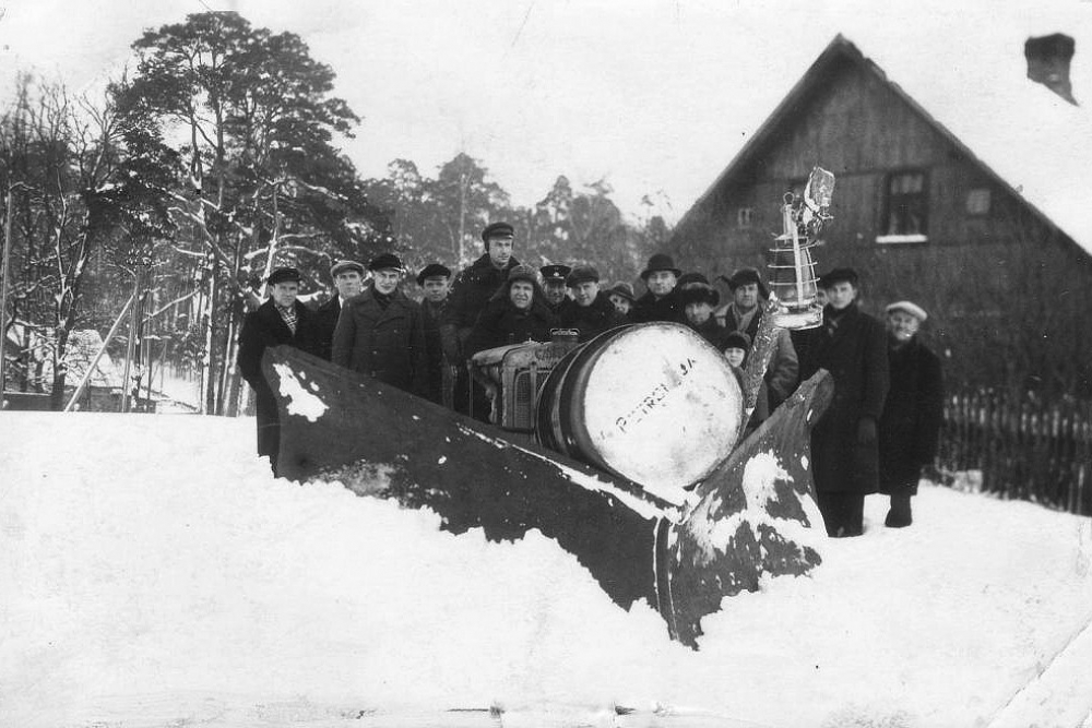 Bauskas ceļu pārvaldes darbinieki 11. ceļu inženieru postenī pie sniega arkla jeb šķūres, kas uzmontēta traktoram “Caterpillar”. 30. gadu beigas.