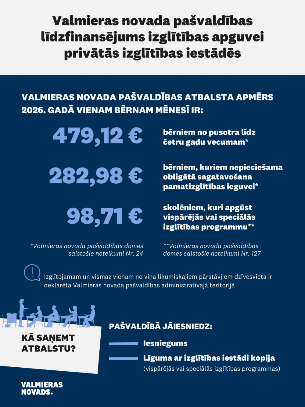 Lai saņemtu atbalstu, bērna likumiskajam pārstāvim ir jāiesniedz pašvaldībā iesniegums. Ja bērns apmeklē privāto vispārējās izglītības iestādi, iesniegumam jāpievieno arī līguma ar izglītības iestādi kopija. Pašvaldība atbalstu izmaksā privātajai izglītības iestādei, pamatojoties uz noslēgto trīspusējo līgumu starp pašvaldību, izglītības iestādi un bērna likumisko pārstāvi. Pakalpojuma apraksts pieejams tīmekļvietnē valmierasnovads.lv, sadaļā “Pakalpojumi” – “Izglītība”.