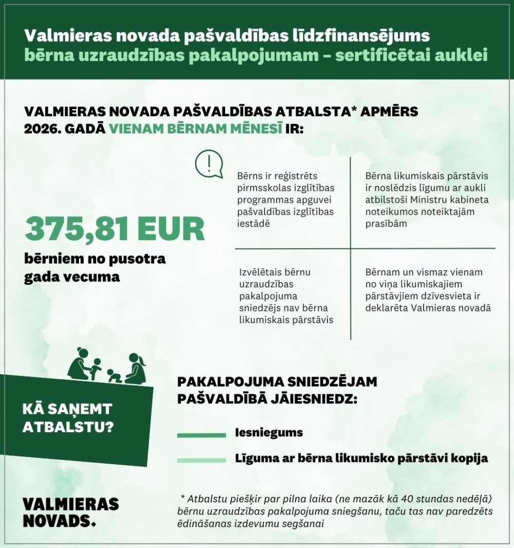 29. janvārī Valmieras novada pašvaldības domes sēdē apstiprināts finansējuma apmērs 2026. gadā – 375,81 eiro mēnesī vienam bērnam.