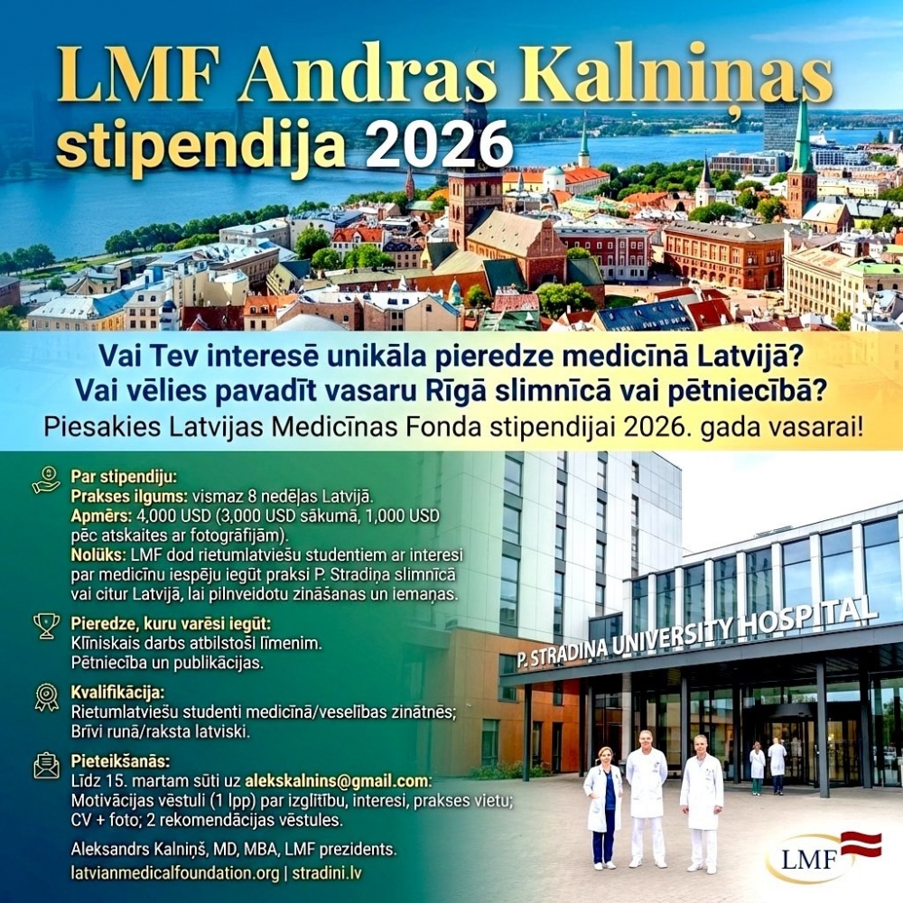 LMF Andras Kalniņas stipendija turpina godināt Andras Kalniņas mantojumu, iedvesmojot jauno paaudzi veltīt sevi veselības aprūpei un stiprinot saites starp latviešu medicīnas kopienām pasaulē.