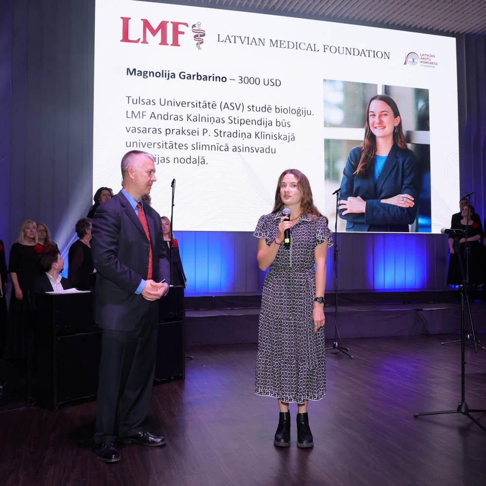 Attēlā: LMF prezidents Aleksandrs Kalniņš un stipendiāte Magnolija Garbarino 2025. gada 11. jūnijā Rīgā, 10. Latvijas ārstu kongresā, stipendiju pasniegšanā.