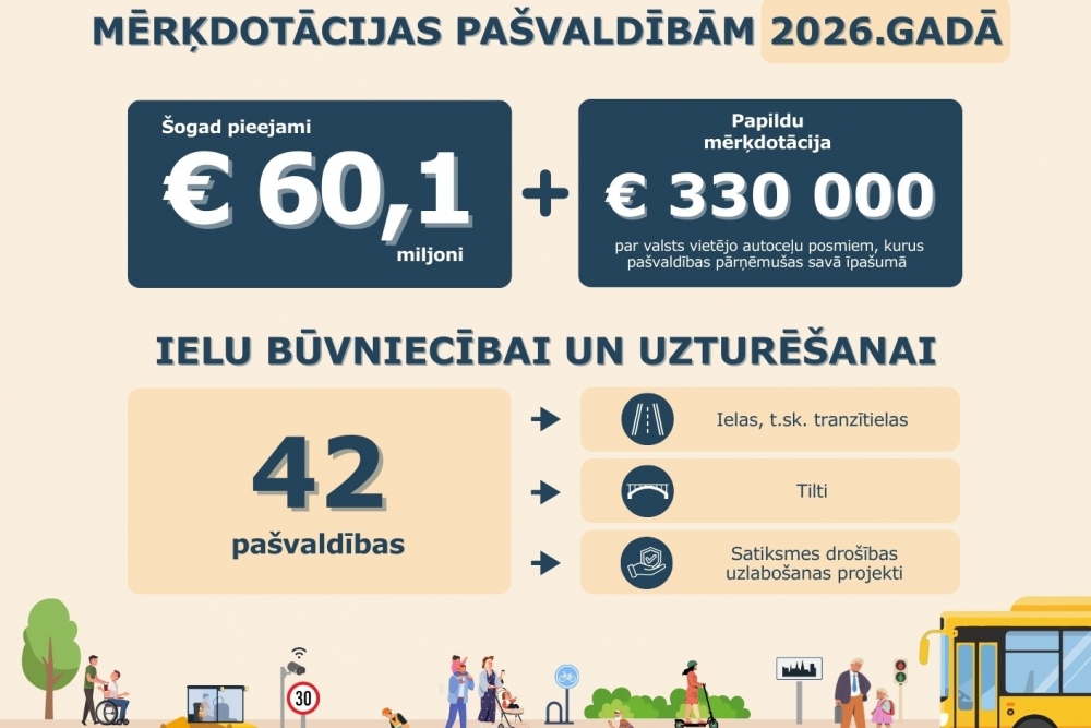 Pagājušogad pašvaldībām mērķdotācijām ielu būvniecībai un uzturēšanai kopumā tika piešķirti 60,1 milj. eiro, savukārt izlietoti – 53,69 milj. eiro. Neizlietotais finansējums paliek pašvaldību rīcībā ieguldīšanai ielu uzturēšanā un būvniecībā. No 2025. gadā izlietotā finansējuma pašvaldības 65% ieguldījušas autoceļu un ielu uzturēšanai, savukārt 35% autoceļu un ielu būvniecībai. Satiksmes drošības uzlabošanai pašvaldības kopumā ieguldījušas 5,5 milj. eiro jeb 10% no izlietotā finansējuma. Visvairāk no saņemtā finansējuma jeb 1,1 milj. eiro satiksmes drošības uzlabošanai pagājušogad ir ieguldījusi Krāslavas pašvaldība (93% no izlietotā finansējuma).