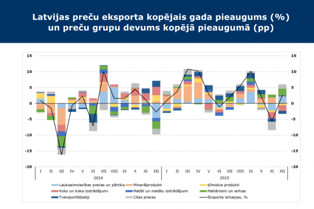 2025. gada decembra eksporta struktūrā nozīmīgāko devumu eksporta pieaugumā pret pērnā gada decembri nodrošināja mehānismu, ierīču, tostarp elektroierīču (2,2 procentpunkti), lauksaimniecības preču un pārtikas (arī 2,2 procentpunkti), kā arī pārējo preču (1,3 procentpunkti) eksports. Mehānismu, ierīču, tostarp elektroierīču eksports bija par 15,3% lielāks nekā gadu iepriekš, lauksaimniecības preču un pārtikas eksports pieauga par 9,7%, bet pārējo preču eksports palielinājās par 12,6%. Vienlaikus koka un koka izstrādājumu eksports saruka par 10,4%, tādējādi par 1,7 procentpunktiem negatīvi ietekmējot šīs produkcijas grupas devumu eksporta pieaugumā.