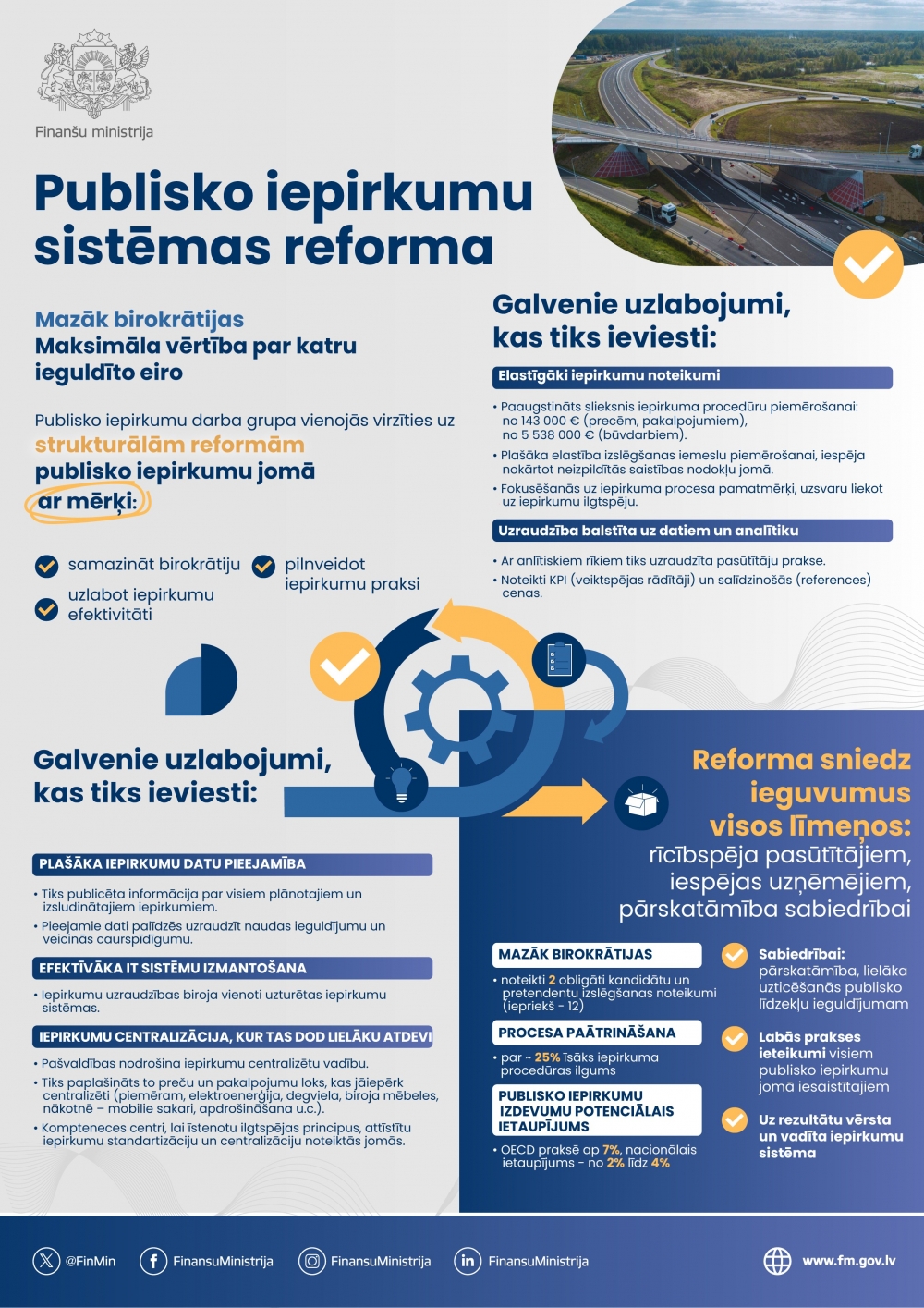 Publisko iepirkumu reforma paredz mazināt administratīvo slogu, vienkāršot procedūras un saīsināt iepirkumu norises laiku par aptuveni 25%, kā arī būtiski samazināt likumā detalizēti regulēto procedūru apjomu. Vienlaikus, balstoties starptautiskajās aplēsēs, publisko iepirkumu sistēmas racionalizācija var dot ievērojamu ietaupījumu – nacionālā līmenī potenciāli 2–4% apmērā no kopējiem publisko iepirkumu izdevumiem.