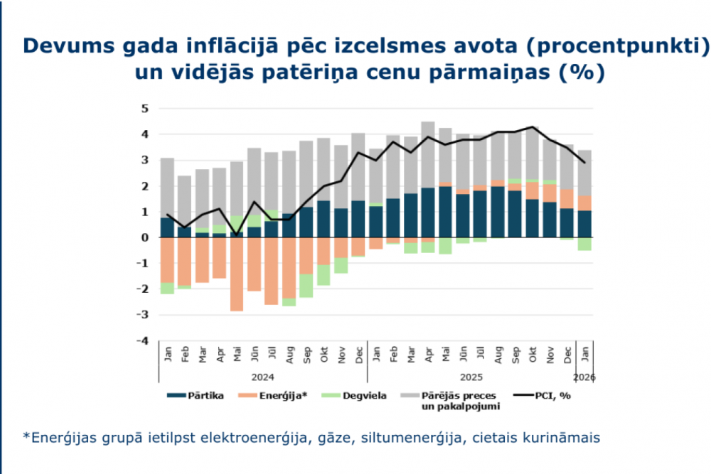 Pērnajā gadā pastiprināta uzmanība bija pievēsta pārtikas cenu dinamikai, jo tās cenas būtiski pieauga gan salīdzinājumā ar iepriekšējiem gadiem, gan uz Eiropas Savienības vidējā pieauguma fona. Sagaidāms, ka arī šogad pārtikas cenu pieaugums turpināsies un noteiks nozīmīgu devumu vidējā inflācijā. Tomēr pārtikas un bezalkoholisko dzērienu cenu kāpums 2026. gadā būs būtiski zemāks salīdzinājumā ar pērnā gada vidējo pieaugumu 6,2% apmērā. 2026. gada janvārī pārtika un bezalkoholiskie dzērieni gada izteiksmē sadārdzinājās par 3,9%. Visticamāk, ka turpmākajos mēnešos pārtikas cenu pieaugums vēl nedaudz mazināsies, ko veicinās piena produktu, graudaugu, cukura un kafijas cenu kritums pasaules biržās. Papildus tam, no šī gada 1. jūlija līdz 12% samazināsies PVN likme atsevišķiem pamata pārtikas produktiem (maizei, pienam, mājputnu gaļai, olām), kas arī nodrošinās pamatu pārtikas cenu samazinājumam.