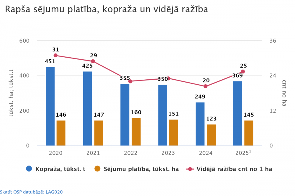 2025. gadā par 120,1 tūkst. tonnu jeb 48,2 % pieauga rapša sēklu kopievākums, platībām palielinoties par 22,6 tūkst. hektāru jeb 18,4 %. Ziemas rapša sējumu platība pieauga par 33,1 tūkst. hektāru jeb 33,0 % un vidējā ražība no viena hektāra palielinājās no 21,3 centnera 2024. gadā, kad tā bija zemākā pēdējo sešu gadu laikā, līdz 26,6 centneriem 2025. gadā. Vasaras rapša platība samazinājās par 47,5 % un vidējā ražība par 4,1 centneru no hektāra jeb 25,3 %.