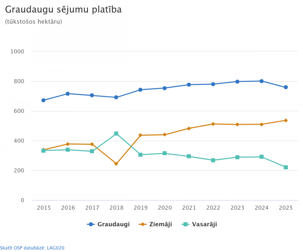 Laikā no 2018. līdz 2024. gadam bija vērojams graudaugu sējumu platību pieaugums, bet 2025. gadā sējumu platība samazinājusies par 5,4 % jeb 43,1 tūkst. hektāru, sasniedzot 757,7 tūkst. hektāru.