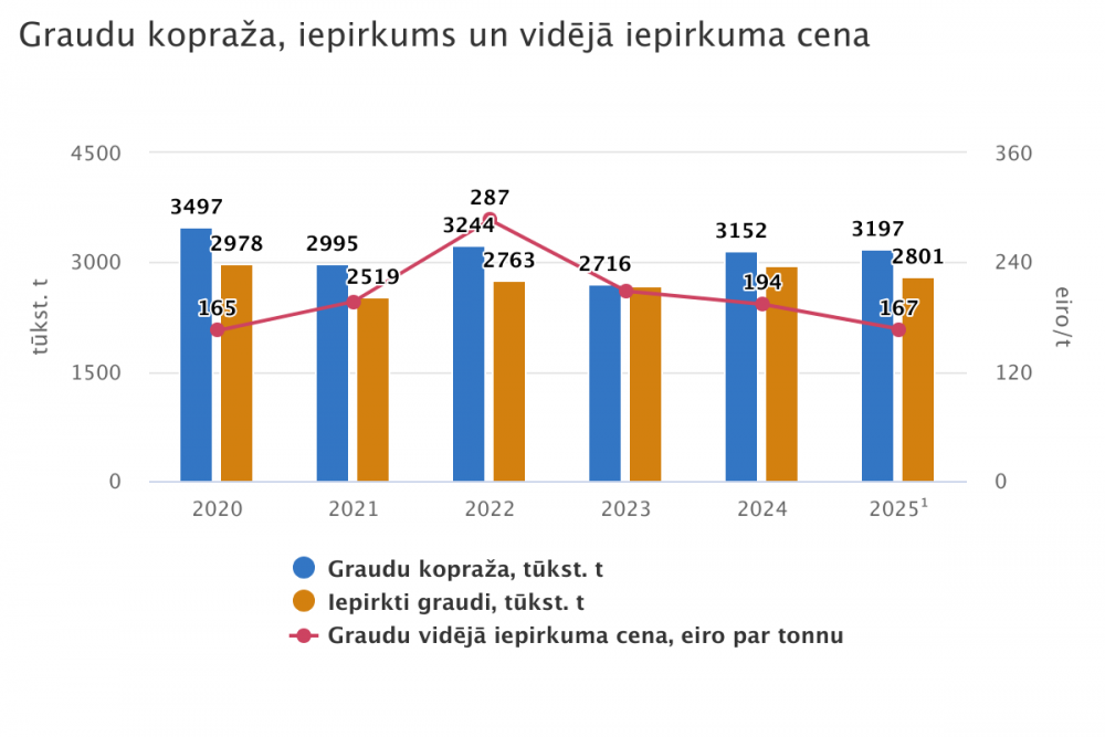 Pērn kopumā iepirkts 2 800,6 tūkst. tonnu graudu, kas ir par 166,9 tūkst. tonnu jeb 5,6 % mazāk nekā gadu iepriekš. Graudu vidējā iepirkuma cena samazinājusies no 193,95 eiro par tonnu 2024. gadā līdz 166,77 eiro 2025. gadā.