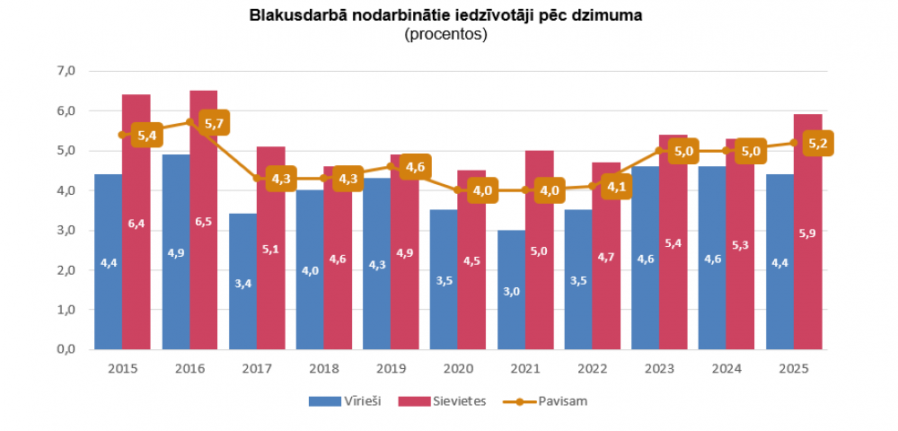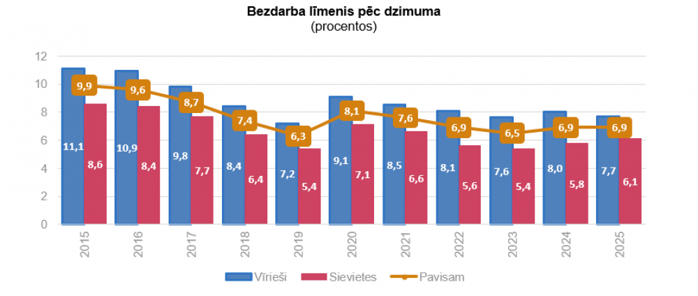 Sievietēm bezdarba līmenis joprojām saglabājas zemāks nekā vīriešiem (attiecīgi 6,1% un 7,7%).