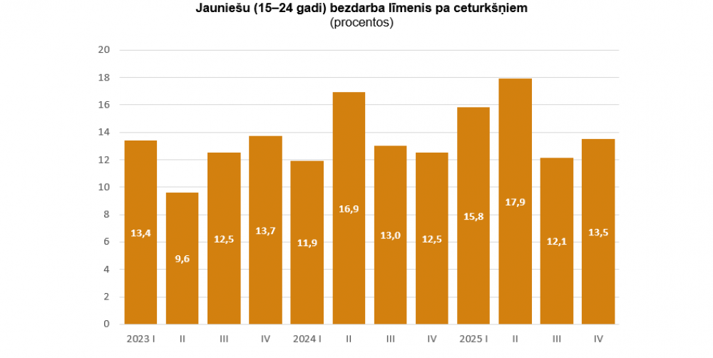 Pērn 4. ceturksnī jauniešu bezdarba līmenis bija 13,5%, kas ir par 1,4 procentpunktiem augstāks nekā 3. ceturksnī. Jauniešu bezdarbnieku skaits samazinājās par 0,3 tūkstošiem un bija 8,5 tūkstoši jeb 13,3% no kopējā bezdarbnieku skaita (3. ceturksnī – arī 13,3%).