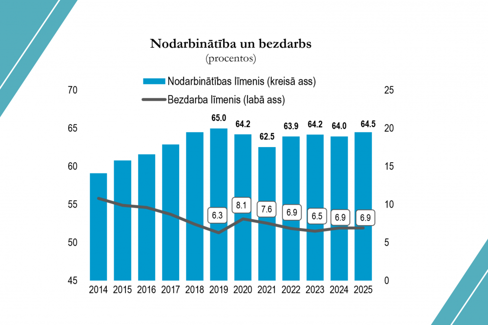 Darba tirgus joprojām saskaras ar vairākiem strukturāliem izaicinājumiem. Saglabājas augsts ilgstošo bezdarbnieku īpatsvars – aptuveni 1/3 bezdarbnieku darba meklējumos bija ilgāk par 12 mēnešiem. Darbaspēka piedāvājumu vienlaikus ierobežo prasmju neatbilstība un izteikta reģionālā nesabalansētība, kā arī nelabvēlīgās demogrāfiskās tendences – 2025. gadā iedzīvotāju skaits vecumā no 15–74 gadiem samazinājās par 12,5 tūkstošiem salīdzinājumā ar 2024. gadu.