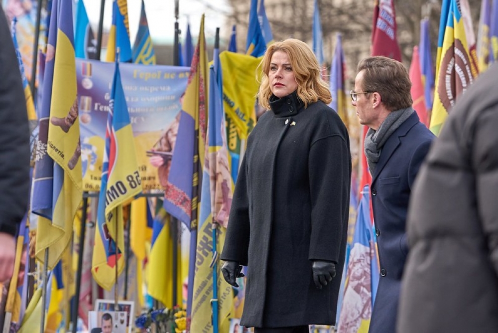 Latvijas Ministru prezidente kopā ar Ukrainas prezidentu un citiem Eiropas valstu līderiem arī ieturēja klusuma brīdī Maidana laukumā, godinot bojā gājušos Ukrainas aizstāvjus.