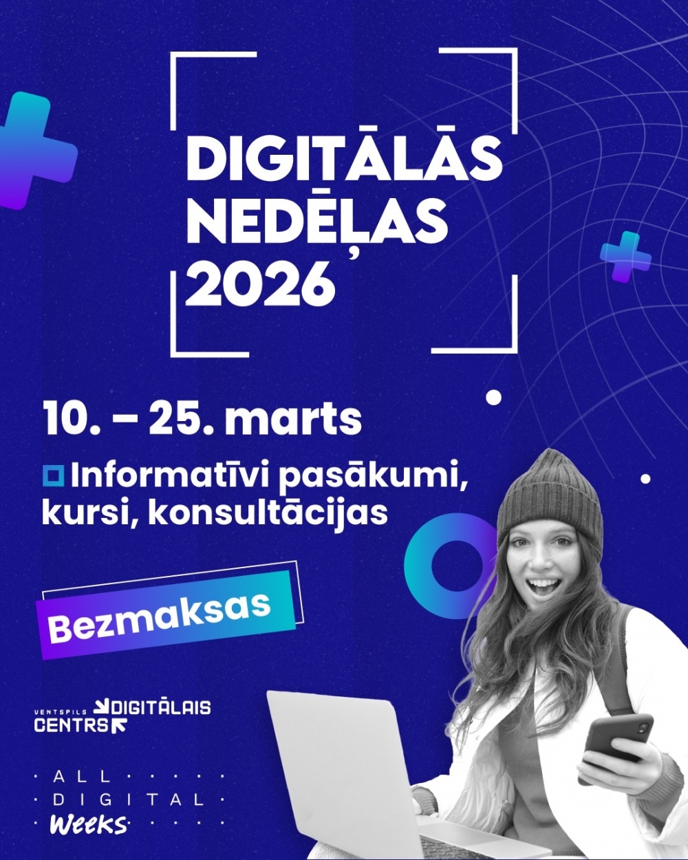 “Digitālo nedēļu 2026” aktivitātes norisināsies no 10. līdz 25. martam klātienē un tiešsaistē. Pieteikties iespējams, aizpildot anketu šeit. Visas aktivitātes ir bezmaksas!