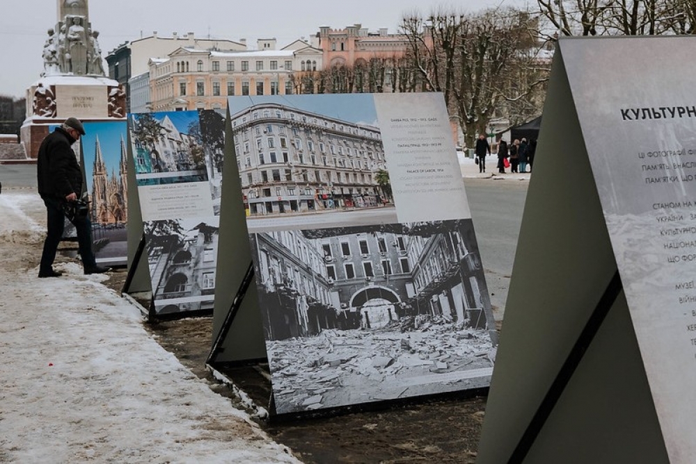 Fotogrāfijās redzami Ukrainas kultūras mantojuma objekti pirms un pēc iznīcināšanas, un katrs attēls ir kā kluss, bet nepielūdzams pierādījums tam, cik trausla ir kultūras telpa bruņota konflikta priekšā.