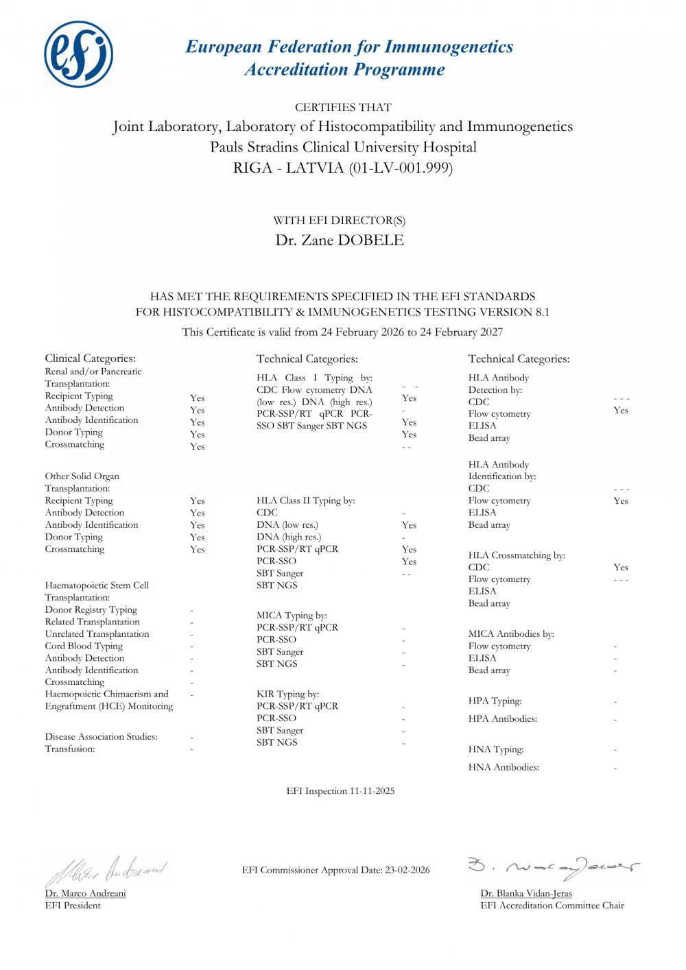 EFI akreditācija apliecina, ka Stradiņa slimnīcas Apvienotajā laboratorijā veiktie imūnģenētiskie izmeklējumi atbilst augstākajiem starptautiskajiem kvalitātes standartiem, kas nepieciešami drošai orgānu saderības izvērtēšanai transplantācijas procesā. Tā ir obligāta prasība valstīm, kas vēlas iesaistīties kopējā Ziemeļvalstu orgānu apmaiņas sistēmā.