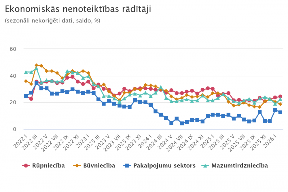 Pakalpojumu sektorā pēc sezonāli koriģētiem datiem konfidences rādītājs februārī bija 3,6, un uzņēmēju noskaņojuma lēnais, pakāpeniskais kāpums, kas bija vērojams kopš 2025. gada augusta, ir pagaidām apstājies.