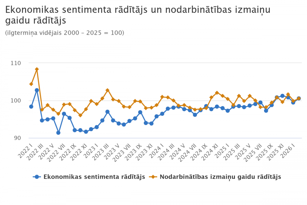 2026. gada februārī ekonomikas sentimenta rādītājs3 Latvijā bija 100,6 (iepriekšējā mēnesī 99,5). Arī nodarbinātības izmaiņu gaidu rādītājs februārī, pieaugot līdz 100,5, pārsniedzis ilgtermiņa vidējo vērtību, bet, salīdzinot ar janvāri, tas pieaudzis par 0,6.