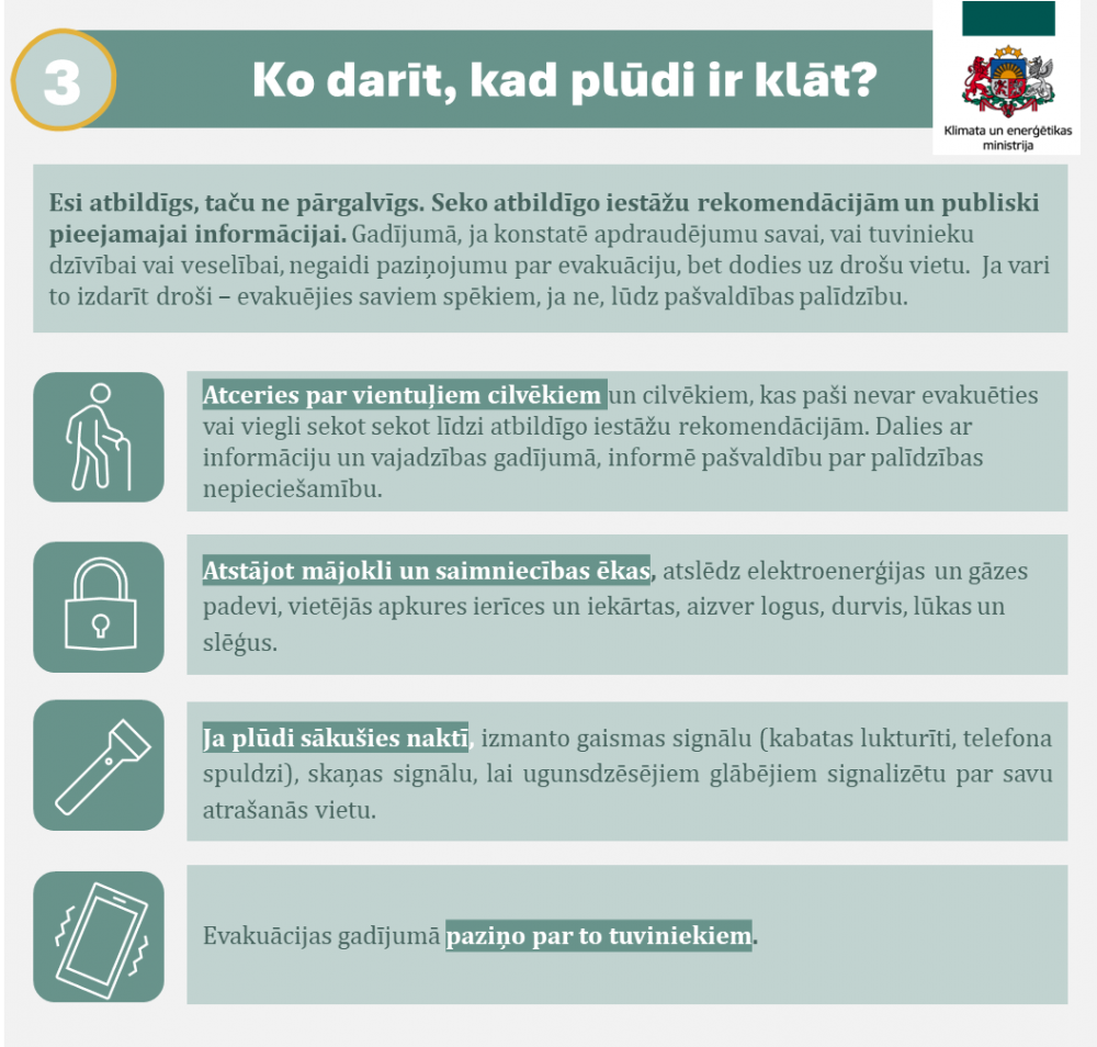 Iedzīvotāji un pašvaldības aicināti izmantot Klimata un enerģētikas ministrijas sagatavoto vizuālo ceļvedi par sagatavošanos palu sezonai.