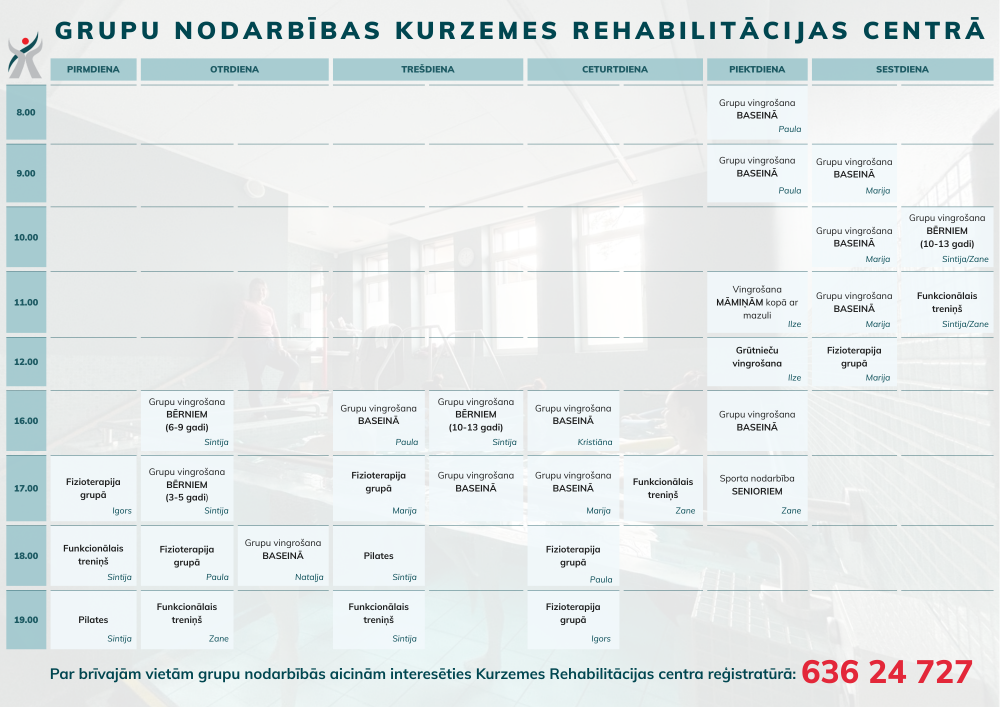 Turpmāk otrdienās un ceturtdienās plkst. 18.00 fizioterapijas nodarbības grupās vadīs fizioterapeite Paula Millere, savukārt baseina nodarbības piektdienās plkst. 16.00 un trešdienās plkst. 17.00 fizioterapeiti vadīs uz maiņām, rotējot savā starpā.