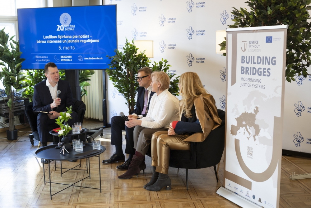 Notāru dienu ietvaros notika arī tiešsaistes diskusija, kurā tieslietu ministre Inese Lībiņa-Egnere, Notāru padomes priekšsēdētājs Aigars Kaupe un Latvijas Universitātes Psiholoģijas fakultātes docente Evija Strika runāja par jauno regulējumu laulības šķiršana procesā pie notāra, kas paredz, ka vienošanās par nepilngadīgu bērnu aizgādību, saskarsmi un uzturlīdzekļiem laulības šķiršanas gadījumā turpmāk jānoformē notariāla akta formā. Sarunā īpaša uzmanība tika pievērsta bērna interesēm un vecāku atbildībai rūpīgāk kā līdz šim savā starpā apspriest kārtību, kā abi vecāki varēs būt līdzdalīgi bērna dzīvē. Gadījumā, ja kāda no pusēm panākto vienošanos vēlāk nepildīs, tad varēs uzsākt piespiedu izpildi bez tiesvedības procesa.
