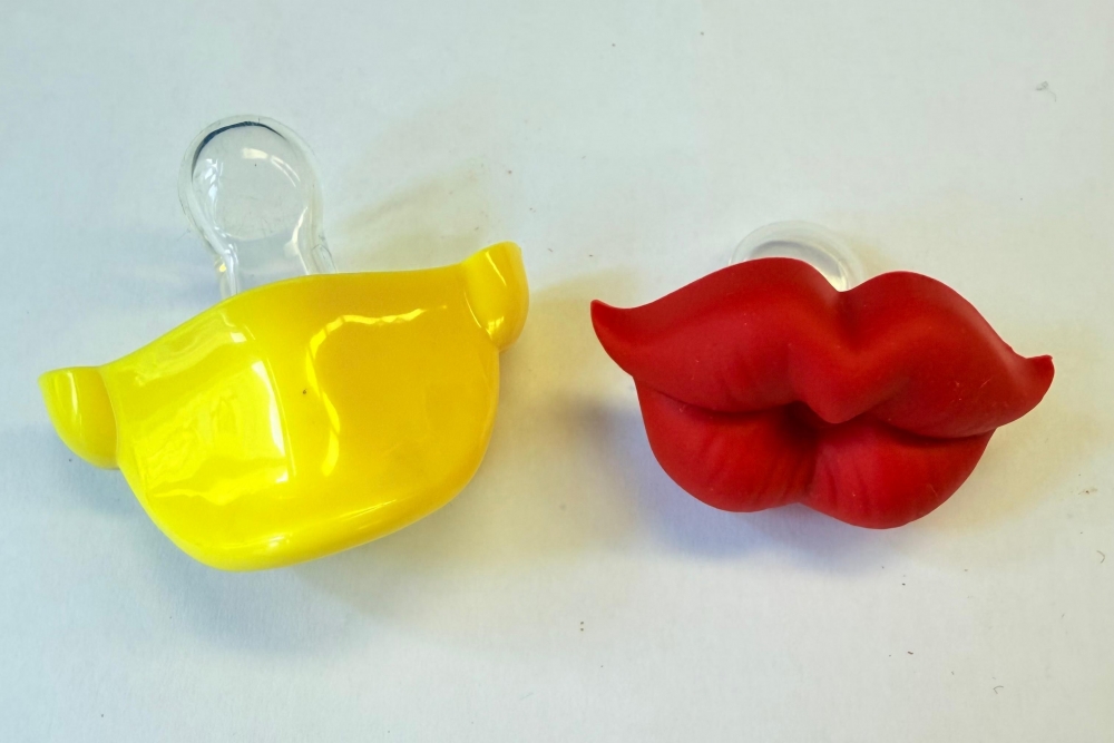 Attēlā: knupītis (māneklītis) – neatbilst standartu prasībām, nav divu ventilācijas caurumu, nosmakšanas risks (nedroša prece).