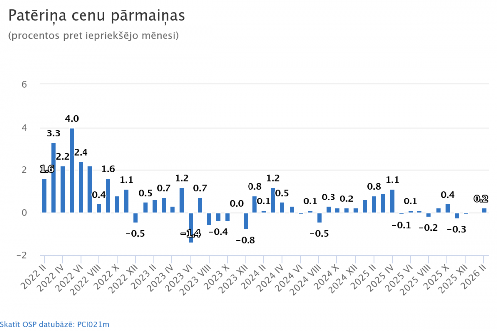 2026. gada februārī, salīdzinot ar 2026. gada janvāri, vidējais patēriņa cenu līmenis palielinājās par 0,2 %