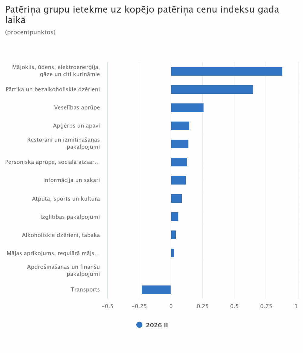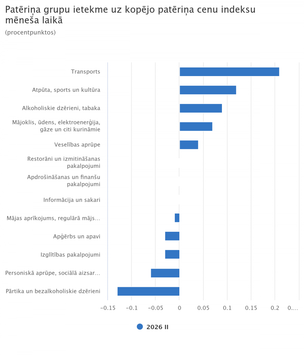 Būtiskākā ietekme uz cenu līmeņa izmaiņām 2026. gada februārī, salīdzinot ar 2026. gada janvāri, bija transporta grupai (+0,2 procentpunkti), atpūtai, sportam un kultūrai (+0,1 procentpunkts), alkoholiskajiem dzērieniem, tabakai (+0,1 procentpunkts), mājoklim, ūdenim, elektroenerģijai, gāzei un citiem kurināmajiem (+0,1 procentpunkts), kā arī pārtikai un bezalkoholiskajiem dzērieniem (−0,1 procentpunkts) un personiskajai aprūpei, sociālajai aizsardzībai, dažādām precēm un pakalpojumiem (−0,1 procentpunkts).