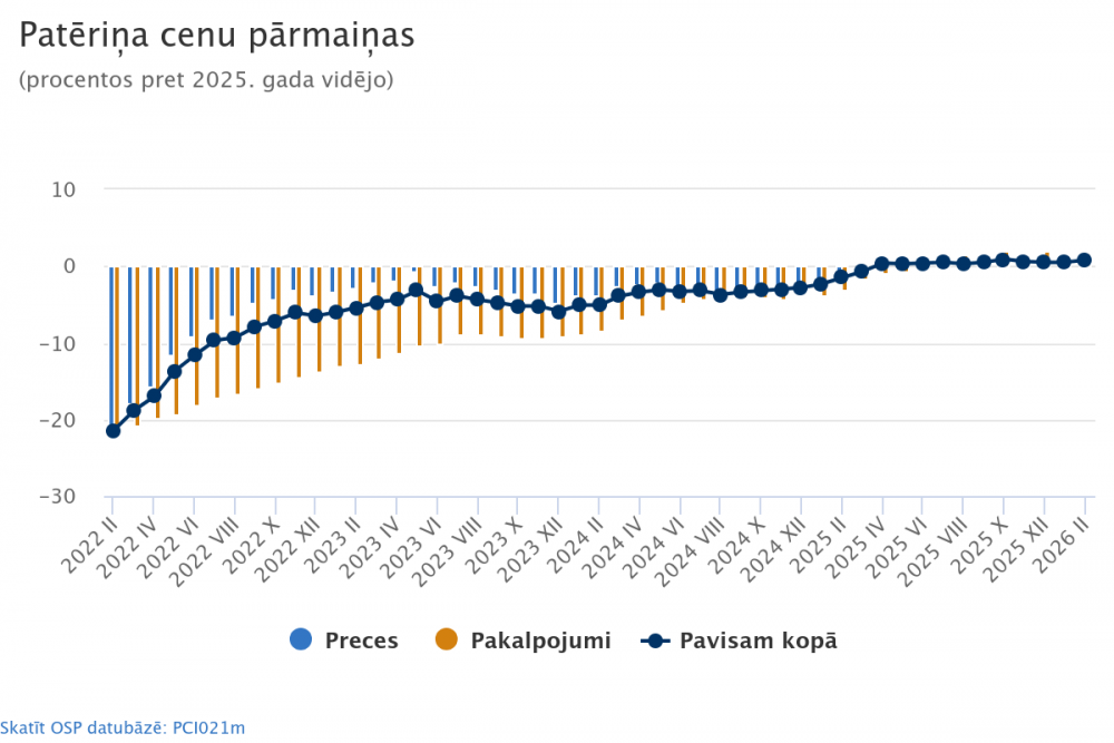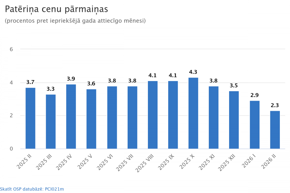 2026. gada februārī, salīdzinot ar 2025. gada februāri, vidējais patēriņa cenu līmenis* pieauga par 2,3 %. Lielākā ietekme uz vidējā patēriņa cenu līmeņa izmaiņām bijamājoklim, ūdenim, elektroenerģijai, gāzei un citiem kurināmajiem (+0,9 procentpunkti), galvenokārt siltumenerģijai un elektroenerģijai, pārtikai un bezalkoholiskajiem dzērieniem (+0,7 procentpunkti). Būtiska ietekme bija arī veselības aprūpei (+0,3 procentpunkti), apģērbam un apaviem (+0,2 procentpunkti), kā arī ar transporta grupai (−0,2 procentpunkti).