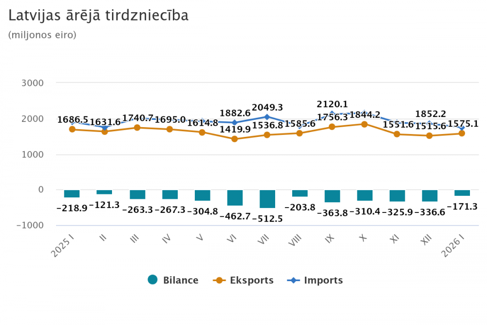 Atbilstoši kalendāri un sezonāli koriģētiem datiem 2026. gada janvārī salīdzinājumā ar 2025. gada janvāri eksporta vērtība faktiskajās cenās bija par 4,7 % mazāka, bet importa – par 5,7 %. Salīdzinot ar mēnesi iepriekš, eksporta vērtība pieauga par 1,7 %, bet importa – par 1,8 %.