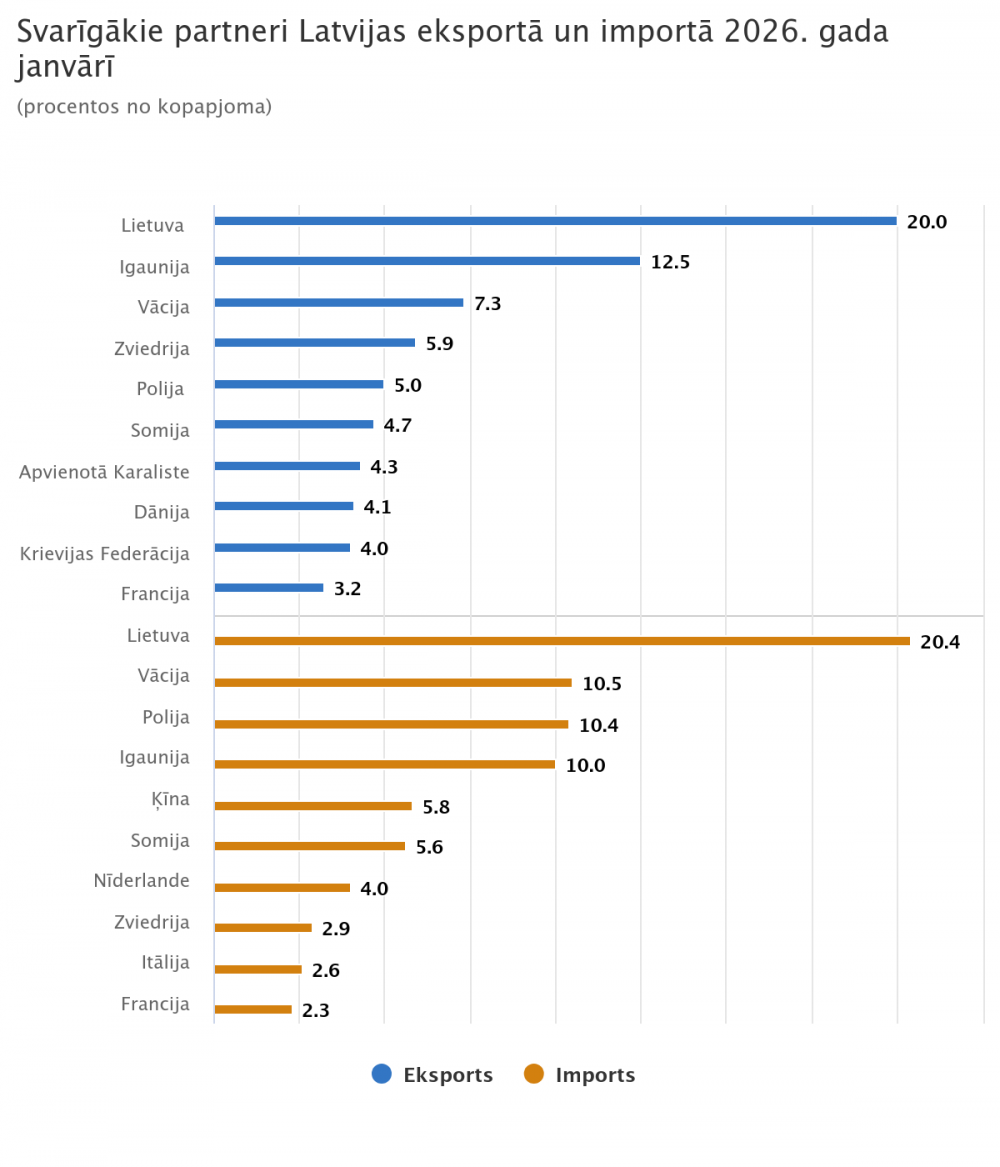 Janvārī svarīgākie eksporta partneri bija Lietuva (20 % no eksporta kopapjoma), Igaunija (12,5 %), Vācija (7,3 %) un Zviedrija (5,9 %). Nozīmīgākie importa partneri – Lietuva (20,4 % no importa kopapjoma), Vācija (10,5 %), Polija (10,4 %) un Igaunija (10 %).