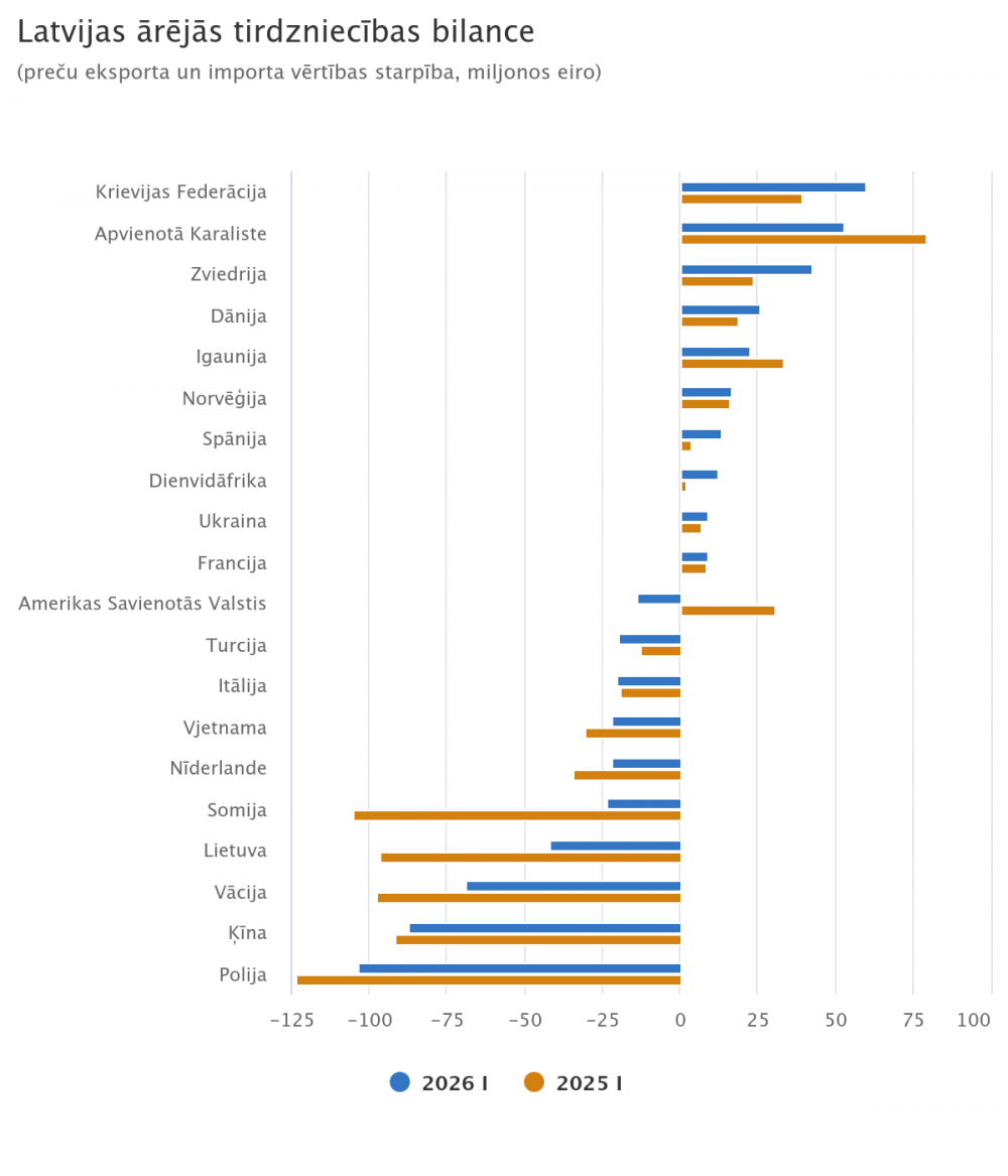2026. gada janvārī Latvijas ārējās tirdzniecības bilance bija pozitīva ar 109 partnervalstīm, preču eksporta vērtībai pārsniedzot importa vērtību. Negatīva tā bija tirdzniecībā ar 57 valstīm.