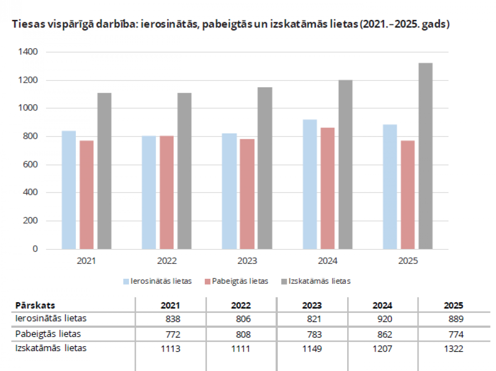 Abās tiesās kopā 2025. gadā ierosinātas 1878 lietas (1706 lietas 2024. gadā).