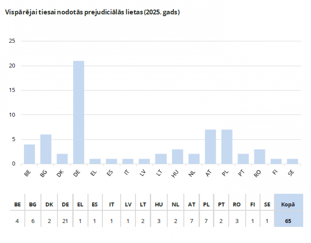 2025. gadā Tiesai iesniegto lūgumu sniegt prejudiciālu nolēmumu ģeogrāfiskās izcelsmes analīze atklāj, ka tie saņemti gandrīz no visām dalībvalstīm, un ievērojamu skaitu lūgumu sniegt prejudiciālu nolēmumu iesniegušas Itālijas (110 lūgumi) un Polijas (63 lūgumi) tiesas [2].