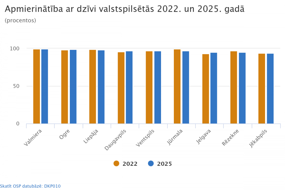 Iedzīvotāju aptauju par apmierinātību ar dzīves kvalitāti pilsētās CSP veica 2025. gadā no jūnija līdz oktobrim Daugavpilī, Jelgavā, Jēkabpilī Jūrmalā, Liepājā, Ogrē, Rēzeknē, Valmierā un Ventspilī. Tajā piedalījās 4 624 respondentu. Aptauja tika veikta Eiropas Komisijas līdzfinansētā projekta "Pilsētu un teritoriāla statistika 2023" ietvaros. Iepriekš CSP šādu aptauju veica 2022. gadā. Aptauja par dzīves kvalitāti pilsētās tiek veikta Eiropas valstīs, aptverot 83 lielākās Eiropas pilsētas, tostarp gandrīz visu Eiropas valstu galvaspilsētas, izmantojot vienotu metodoloģiju. Vairāk par dzīves kvalitāti Eiropas pilsētās var uzzināt šeit.