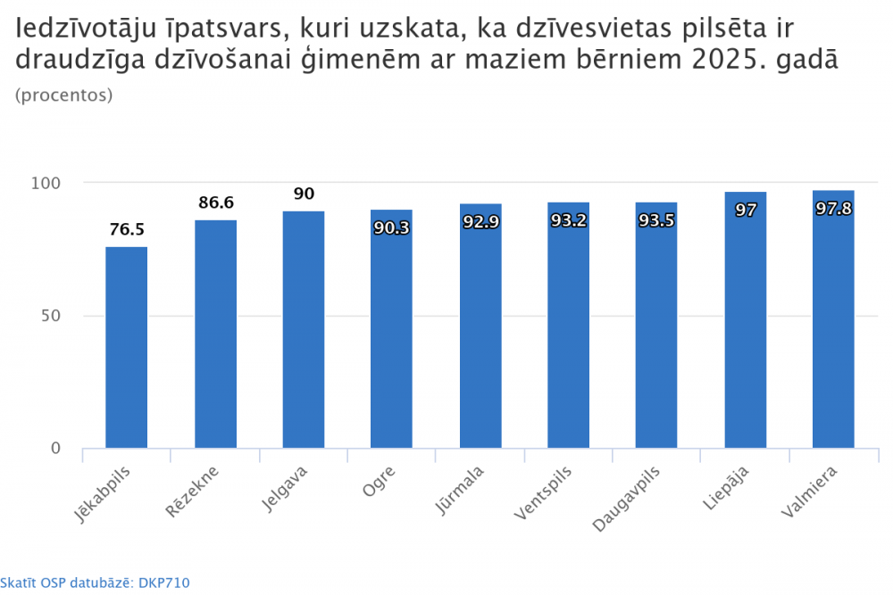 Valstspilsētu iedzīvotāju vērtējumā draudzīgākās pilsētas ģimenēm ar maziem bērniem ir Valmiera (97,8 %) un Liepāja (97,0 %), kā arī Daugavpils (93,5 %), kurā ir visstraujākais īpatsvara pieaugums kopš 2022. gada (par 6,9 procentpunktiem). Kopumā 92,2 % valstspilsētu iedzīvotāju uzskata, ka viņu pilsēta ir draudzīga ģimenēm ar maziem bērniem, savukārt pašu ģimeņu pārstāvji šo rādītāju vērtē vēl augstāk – 95,3 %.