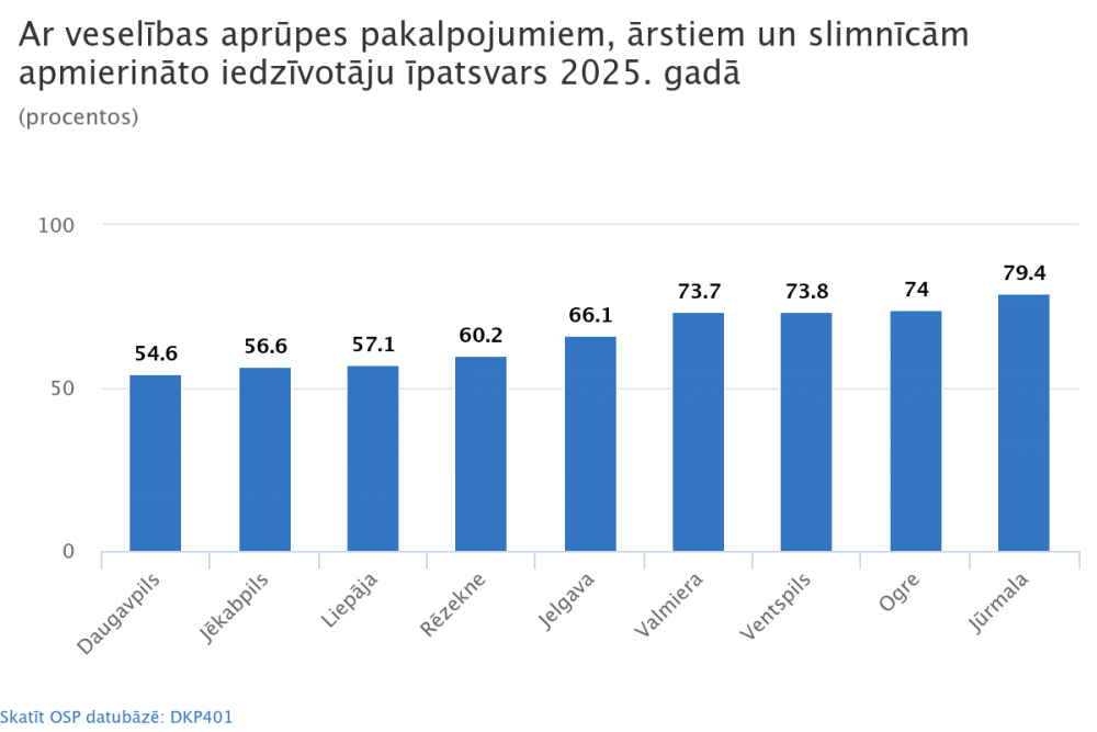 Ar veselības aprūpes pakalpojumiem, ārstiem un slimnīcām apmierinātākie ir Jūrmalas (79,4 %), Ogres (74,0 %) un Ventspils (73,8 %) iedzīvotāji.