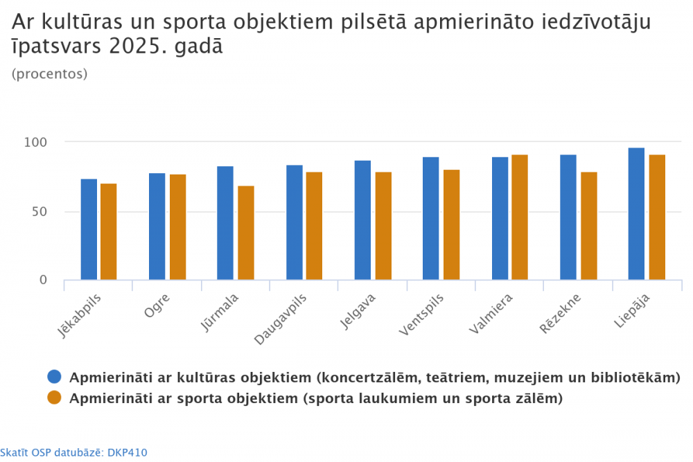 Liepājas un Valmieras iedzīvotāji ir apmierinātākie ar sporta objektiem (sporta laukumiem un sporta zālēm) – attiecīgi 91,7 % un 91,5 %.