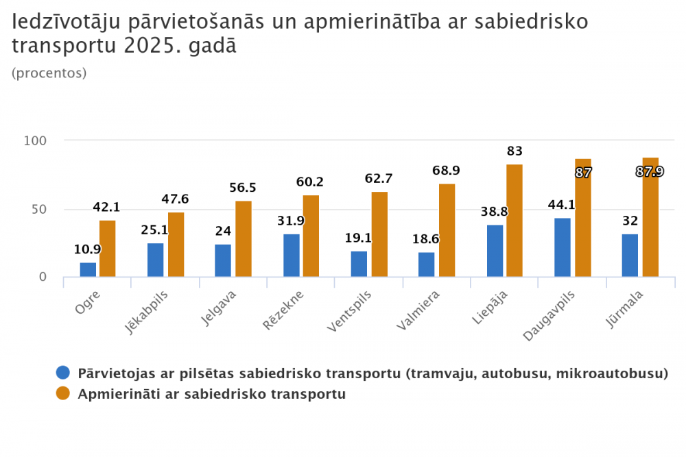 Sabiedrisko transportu kā vienu no galvenajiem pārvietošanās veidiem2 izmanto mazāk nekā puse valstspilsētu iedzīvotāju. Jūrmalā, Daugavpilī un Liepājā ir visaugstākais iedzīvotāju īpatsvars, kuri apmierināti ar sabiedrisko transportu (attiecīgi – 87,9 %, 87,0 % un 83,0 %), viszemākais – ogrēniešu vidū (42,1 %).