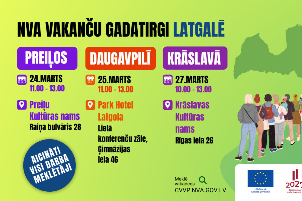Daugavpilī NVA reģionālais vakanču gadatirgus notiks 25. martā no plkst. 11.00 līdz 13.00 Park Hotel Latgola Lielajā konferenču zālē (Ģimnāzijas ielā 46, Daugavpilī). Vakanču gadatirgū Daugavpilī darbiniekus meklēs uzņēmumi Adverza Germany, Axon Cable, Būvlukss & Iļģuciems, Concentrix Latvia, Daugavpils Lokomotīvju Remonta Rūpnīca, Daugavpils satiksme, Foto Help, Latgales Alus D, Lattex D, Latvijas Maiznieks, Light Guide Optics International, Randene, Sacco, Sadales tīkls, Savitra, Vlaba, Valsts robežsardzes Daugavpils pārvalde un citi darba devēji. Vakanču gadatirgū Daugavpilī darba meklētājiem tiks piedāvāts darbs tādās profesijās kā ceha iekārtu mehāniķis, ceha strādnieks, celtņa operators, datu ievades operators, elektromontieris, elektriķis, frēzētājs, kravas automobiļa vadītājs, kvalitātes tehniķis, maiznīcas produkcijas ražošanas iekārtu operators, maizes cepšanas iekārtu operators, mazgāšanas operators, mīklas gatavotājs, noliktavas darbinieks, noliktavas pārzinis, pārdevējs konsultants, ražošanas brigadieris, robežsargs, sociālo mediju satura moderators, skārdnieks, šuvējs, tehnisko sistēmu operators, tehnologs, tehnologs dzērienu ražošanas jomā, tramvaju vadītājs, transporta dispečers koordinators, vilcējautomobiļa vadītājs u. c.
