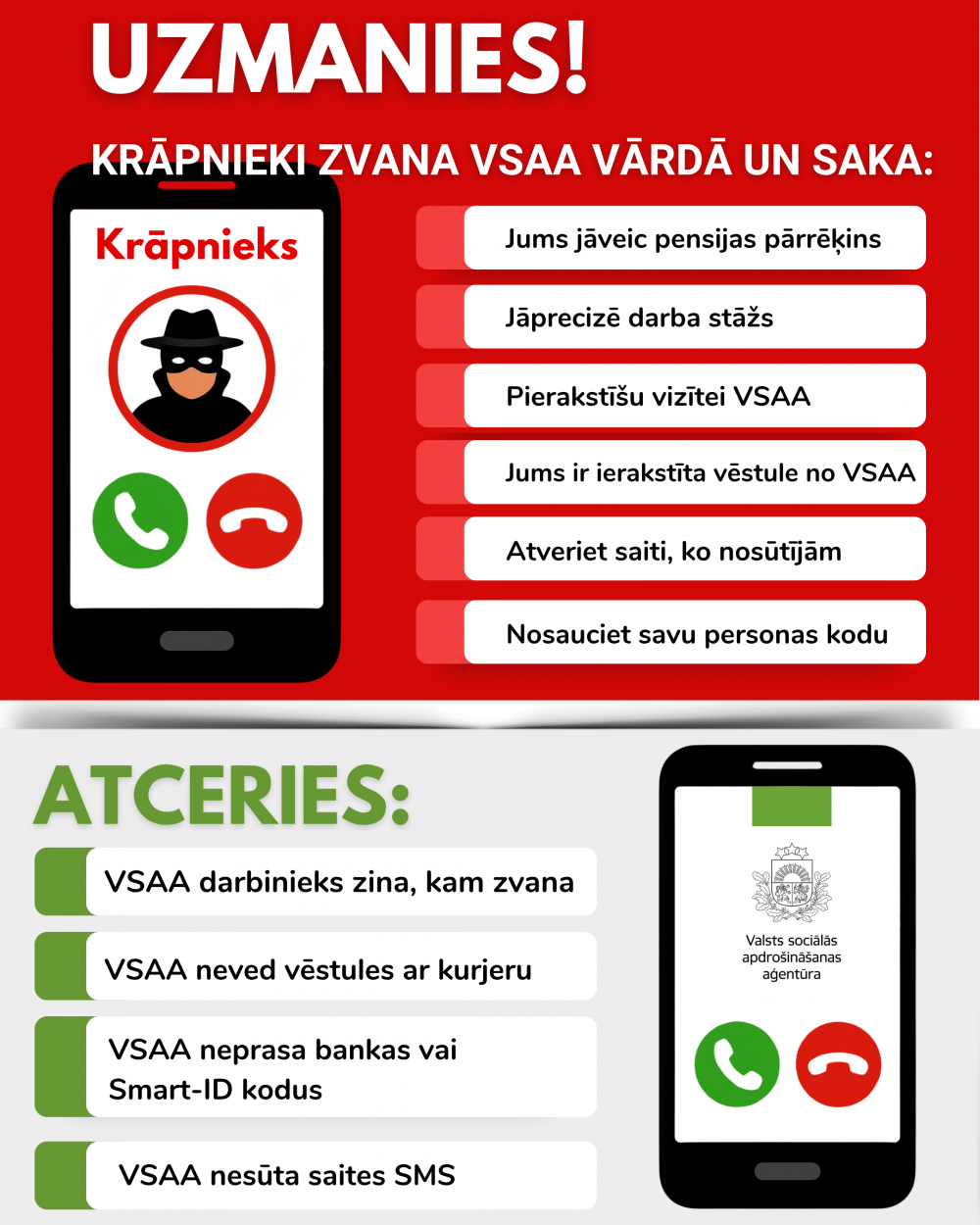 - VSAA darbinieks, zvanot klientam, jau zina, kam zvana, un neprasa personas kodu, adresi vai bankas datus.