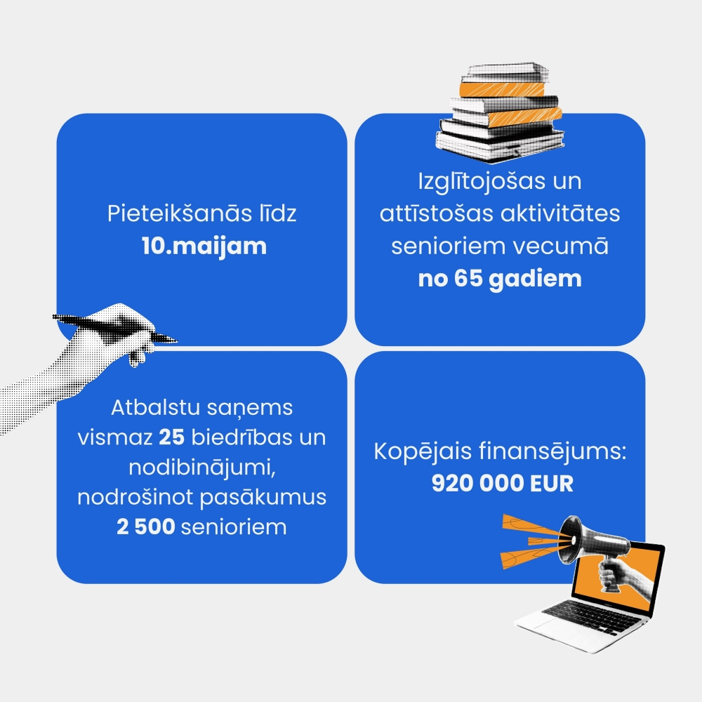 Konkursa mērķis ir atbalstīt vismaz 25 biedrības un nodibinājumus, kas īstenos izglītojošas un attīstošas aktivitātes senioriem vecumā no 65 gadiem. Programmas kopējais finansējums ir 920 000 eiro.