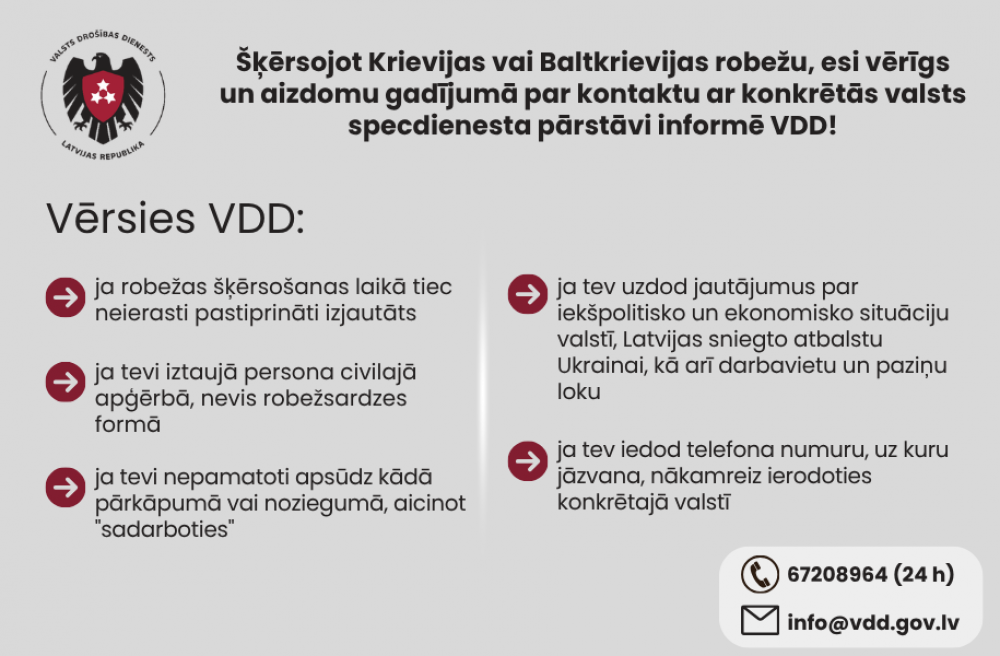 Aizdomu gadījumā par kontaktu ar Krievijas vai Baltkrievijas specdienesta pārstāvi VDD aicina sniegt par to informāciju, zvanot uz dienesta diennakts tālruni 67208964 vai rakstot uz e-pasta adresi info@vdd.gov.lv. VDD garantē informācijas sniedzēja konfidencialitāti.