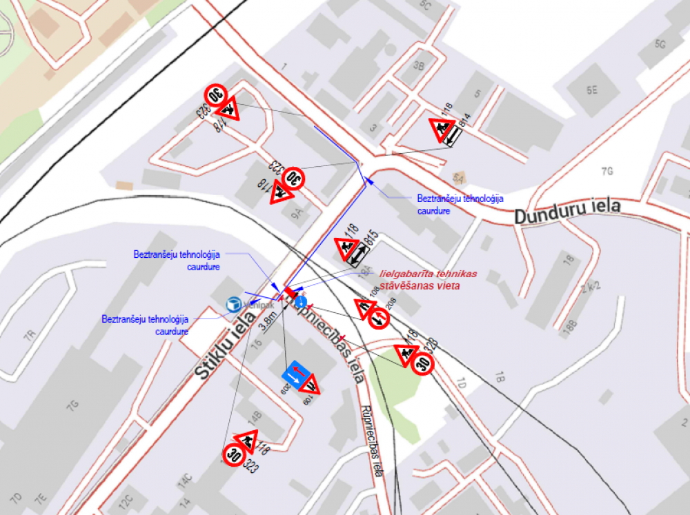 Savukārt pirms Rūpniecības un Stiklu ielas krustojuma, vienā no braukšanas joslām tiks novietota lielgabarīta tehnika, kas kļūs par šķērsli kustībai virzienā uz Stiklu ielu. Apbraucot specializēto tehniku, priekšroka ir transportam, kas virzās pretējā virzienā (no Stiklu ielas).