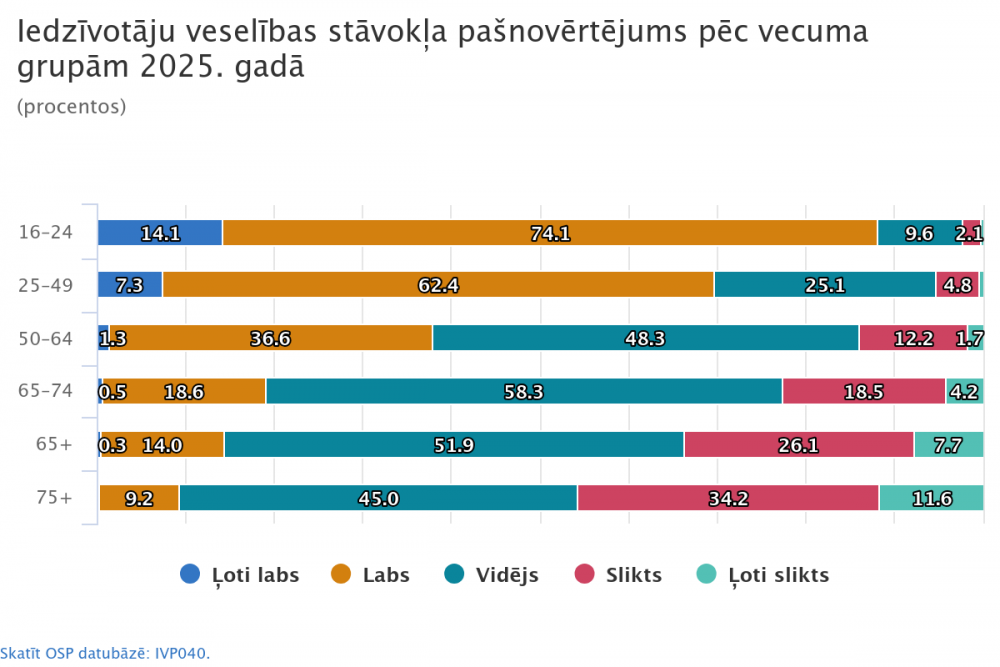 Raugoties datos, divu desmitgažu laikā iedzīvotāju subjektīvais veselības vērtējums kopumā uzlabojies. To, kuri savu veselību vērtē kā “labu” vai “ļoti labu”, kopsumma pieaugusi no 35,1% 2005. gadā līdz 48,2% 2025. gadā.