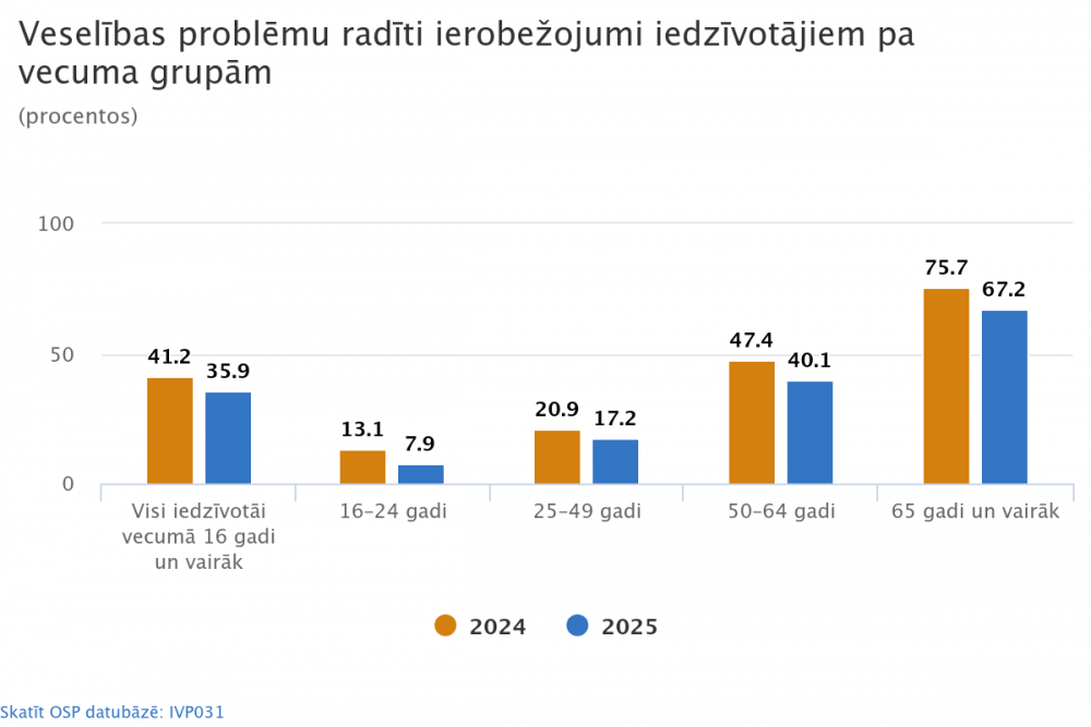 Salīdzinot ar 2024. gadu, par 5,3 procentpunktiem samazinājies to iedzīvotāju īpatsvars, kuri saskārās ar veselības problēmu radītiem ierobežojumiem – 2025. gadā tie bija 35,9% iedzīvotāju, 2024. gadā – 41,2%. Vismazāk uz veselības problēmu radītiem ierobežojumiem norādījuši jaunieši vecumā no 16–24 gadiem, proti, 7,9%, bet visvairāk – seniori vecumā no 65 gadiem (67,2%). 2025. gadā ar ilgstošām (sešus mēnešus vai ilgāk) veselības problēmām** saskārās 42,8% iedzīvotāju vecumā no 16 gadiem, kas ir bez būtiskām izmaiņām, salīdzinot ar 2024. gadu (41,9%).