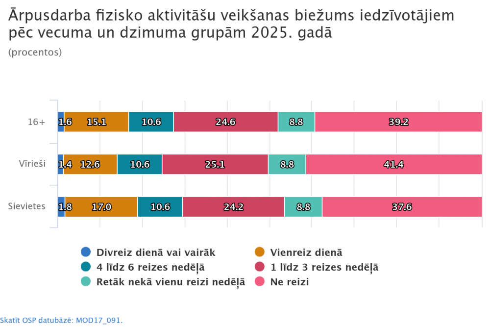 “Sabiedrības veselības pamatnostādnēs 2021.–2027. gadam” viens no rīcības virzieniem ir veselīgs un aktīvs dzīvesveids jeb viens no būtiskākajiem veselību ietekmējošajiem faktoriem. Kopš 2022. gada ir pieaudzis to iedzīvotāju īpatsvars, kuri ar ārpusdarba fiziskām aktivitātēm nodarbojas vienu vai vairākas reizes nedēļā (par 6,6 procentpunktiem, attiecīgi – 52,0% 2025. gadā, 45,4% 2022. gadā). Visaktīvākie iedzīvotāji bija vecuma grupās no 16 līdz 24 gadiem (75,1%) un no 25 līdz 49 gadiem (58,2%). Jāatzīmē, ka iedzīvotāji ar fiziskām aktivitātēm ir sākuši nodarboties arī regulārāk – ja 2022. gadā ar fiziskām aktivitātēm vienreiz dienā nodarbojās 11,0% iedzīvotāju, tad 2025. gadā jau 15,1% iedzīvotāju.